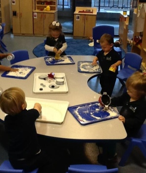 Drawing circles backwards in flour is apparently a pre-writing activity. Here are the budding authors at Little Gems. (Excuse the ill fitting clothing that, when coupled with short hair, makes Natalie seem more boy than girl.)