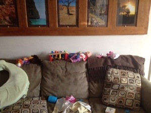 PS One more quick funny thing – the top of our couch is filled with toys.  The only safe place for Nat to keep her stuff away from Elliott.  See below.