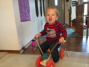 Vocabulary. Mama, Dada, Nat, Ssss, truck, tar (“guitar”), O’s, god (for dog), fire truck, hat, up, no, mine, car, blue, green, one, two… its late, I’m forgetting the others. He’s supposed to know 80-100 words, with 50% understood by people outside of our immediate family. It’s still in stark contrast to Natalie’s singing her ABCs and half-sentences, but he seriously is adding words (and combination of words) everyday.