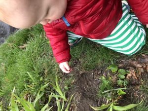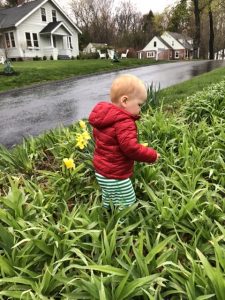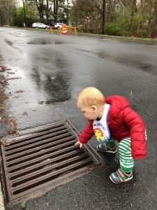 Conor loves to go outside, regardless of the time of day or weather. We took a post dinner “stroll;” we were never more than 5 feet from our property. He touched a worm for the first time (see last photo) and explored a sewer. He liked seeing the cars go past. He crossed through a garden patch and fell straight on his back wide-eyed. He liked the hearts for healthcare workers we have posted in flourescent paper on the garage windows.